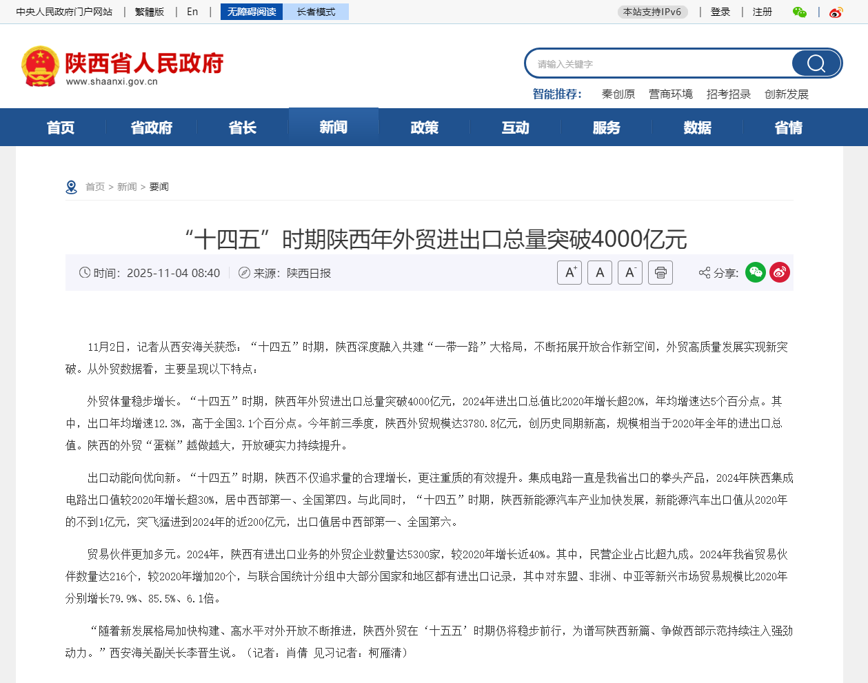 外贸体量稳步增长。“十四五”时期,陕西年外贸进出口总量突破4000亿元,2024年进出口总值比2020年增长超20%,年均增速达5个百分点。其中,出口年均增速12.3%,高于全国3.1个百分点。今年前三季度,陕西外贸规模达3780.8亿元,创历史同期新高,规模相当于2020年全年的进出口总值。陕西的外贸“蛋糕”越做越大,开放硬实力持续提升。