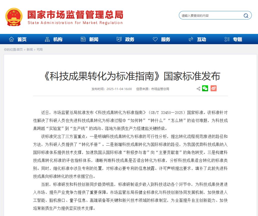 11月4日,从市场监管总局获悉,《科技成果转化为标准指南》国家标准近日正式发布。该标准针对性解决了科研人员在先进科技成果转化为标准过程中“如何转”“转什么”“怎么转”的迫切难题,为科技成果跨越“实验室”到“生产线”的鸿沟搭建起关键桥梁。
