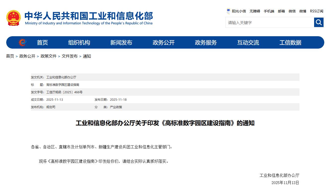 11月19日获悉,工业和信息化部日前印发《高标准数字园区建设指南》(以下简称《指南》),提出到2027年,建成200个左右高标准数字园区,实现园区规上工业企业数字化改造全覆盖,园区管理、服务数字化水平明显提升,形成一批可复制可推广的数智赋能园区发展的典型模式,园区发展质量和效益显著提升。