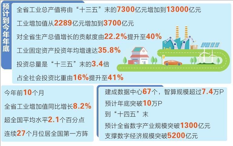 从甘肃省政府新闻办今天下午召开的“决胜收官‘十四五’ 争先进位话发展”主题系列新闻发布会上获悉,预计到今年年底,全省工业总产值将由“十三五”末的7300亿元增加到13000亿元,工业增加值从2289亿元增加到3700亿元,对全省生产总值增长的贡献度由22.2%提升至40% 工业固定资产投资年均增速达35.8%,投资总量是“十三五”末的3.4倍,占全社会投资比重由16%提升至41%,成为拉动全社会投资和支撑工业增长的重要力量,工业经济“稳定器”“压舱石”作用更加凸显。