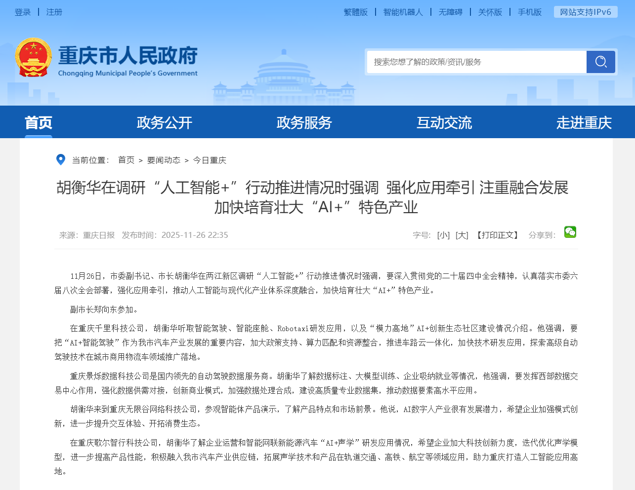 11月26日,重庆市委副书记、市长胡衡华在两江新区调研“人工智能+”行动推进情况时强调,要深入贯彻党的二十届四中全会精神,认真落实市委六届八次全会部署,强化应用牵引,推动人工智能与现代化产业体系深度融合,加快培育壮大“AI+”特色产业。