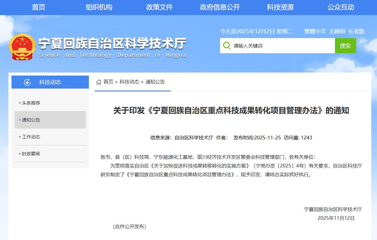 从宁夏回族自治区科技厅获悉,宁夏近日印发《宁夏重点科技成果转化项目管理办法》(以下简称《办法》),进一步提高科技成果转化和产业化水平,推动科技创新与产业创新深度融合。