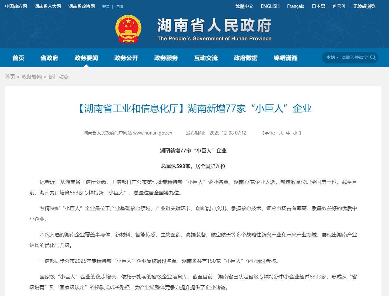 近日从湖南省工信厅获悉,工信部日前公布第七批专精特新“小巨人”企业名单,湖南77家企业入选,新增数量位居全国第十位。截至目前,湖南累计培育593家专精特新“小巨人”,总量位居全国第九位。