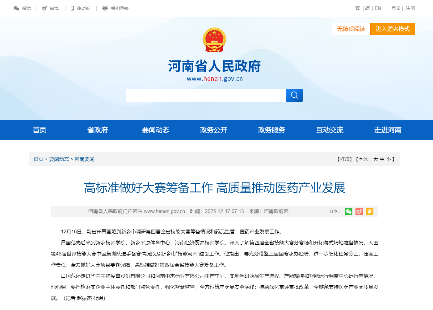12月16日,河南副省长吕国范到新乡市调研第四届全省技能大赛筹备情况和药品监管、医药产业发展工作。