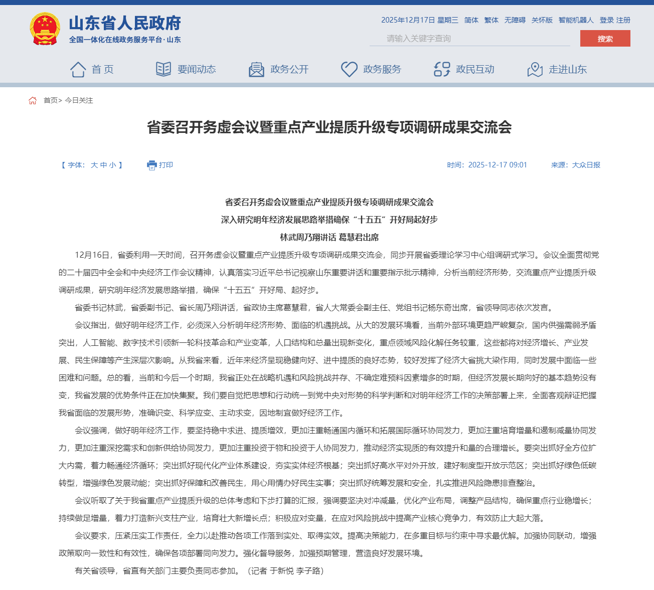 12月16日,山东省委利用一天时间,召开务虚会议暨重点产业提质升级专项调研成果交流会,同步开展省委理论学习中心组调研式学习。会议全面贯彻党的二十届四中全会和中央经济工作会议精神,认真落实习近平总书记视察山东重要讲话和重要指示批示精神,分析当前经济形势,交流重点产业提质升级调研成果,研究明年经济发展思路举措,确保“十五五”开好局、起好步。