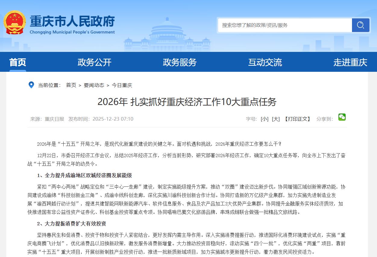 12月22日,市委召开经济工作会议,总结2025年经济工作,分析当前形势,研究部署2026年经济工作,确定10大重点任务等,向全市上下发出了奋战“十五五”开局之年的动员令。