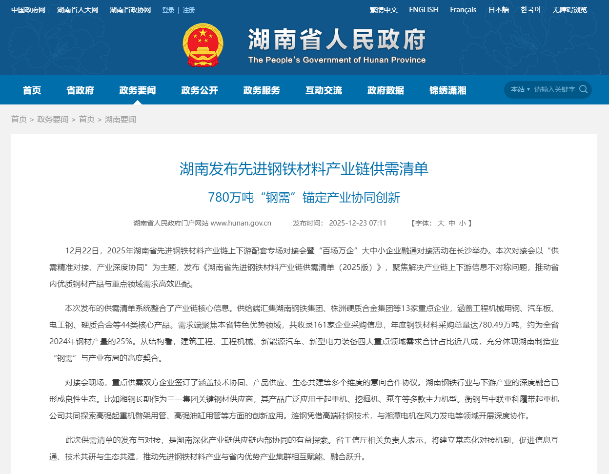 12月22日,2025年湖南省先进钢铁材料产业链上下游配套专场对接会暨“百场万企”大中小企业融通对接活动在长沙举办。本次对接会以“供需精准对接、产业深度协同”为主题,发布《湖南省先进钢铁材料产业链供需清单(2025版)》,聚焦解决产业链上下游信息不对称问题,推动省内优质钢材产品与重点领域需求高效匹配。