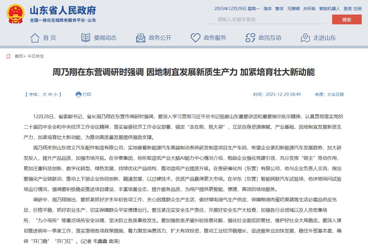12月28日,山东省委副书记、省长周乃翔在东营市调研时强调,要深入学习贯彻习近平总书记视察山东重要讲话和重要指示批示精神,认真贯彻落实党的二十届四中全会和中央经济工作会议精神,落实省委经济工作会议部署,锚定“走在前、挑大梁”,立足自身资源禀赋、产业基础,因地制宜发展新质生产力,加紧培育壮大新动能,为推动高质量发展提供强劲支撑。