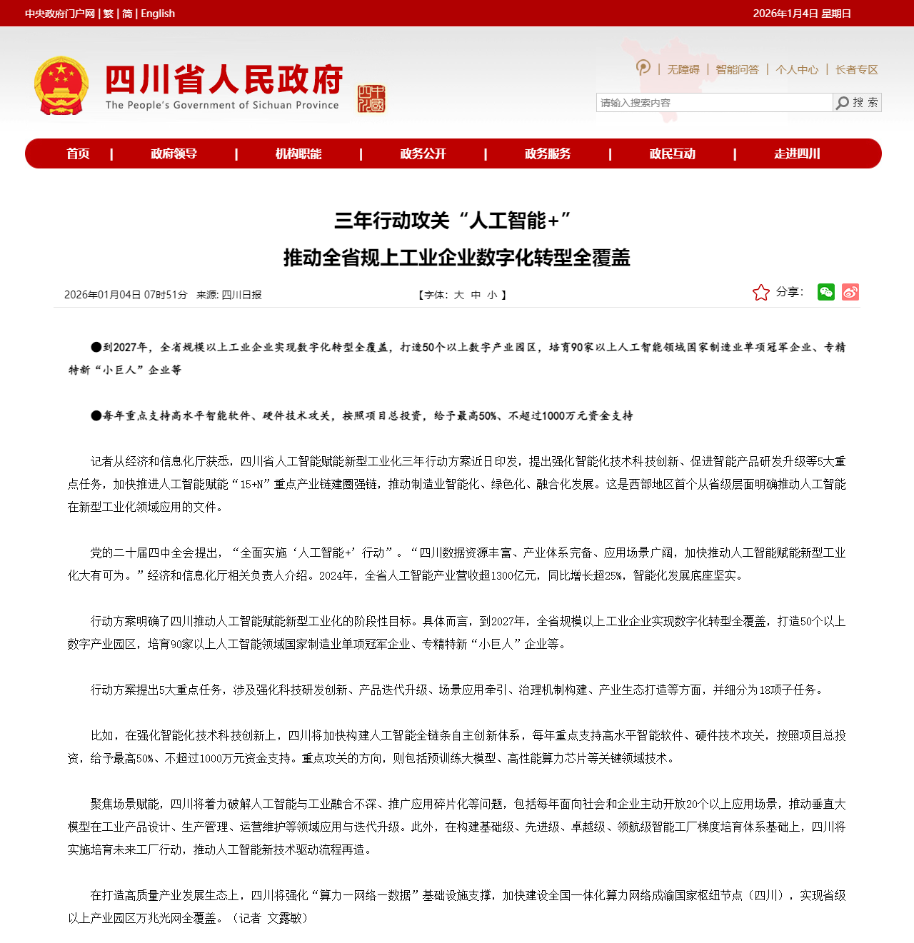 行动方案明确了四川推动人工智能赋能新型工业化的阶段性目标。具体而言,到2027年,全省规模以上工业企业实现数字化转型全覆盖,打造50个以上数字产业园区,培育90家以上人工智能领域国家制造业单项冠军企业、专精特新“小巨人”企业等。
