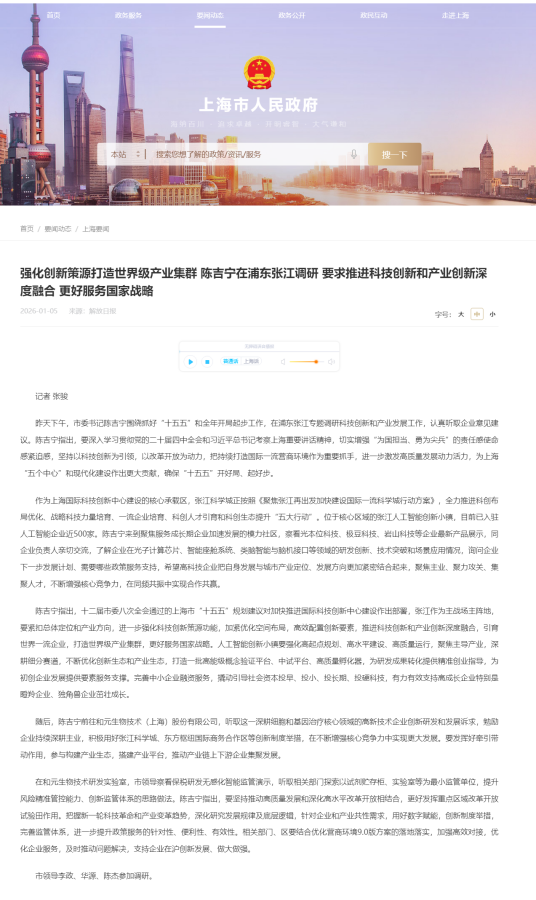 1月4日,上海市委书记陈吉宁围绕抓好“十五五”和全年开局起步工作,在浦东张江专题调研科技创新和产业发展工作,认真听取企业意见建议。陈吉宁指出,要深入学习贯彻党的二十届四中全会和习近平总书记考察上海重要讲话精神,切实增强“为国担当、勇为尖兵”的责任感使命感紧迫感,坚持以科技创新为引领,以改革开放为动力,把持续打造国际一流营商环境作为重要抓手,进一步激发高质量发展动力活力,为上海“五个中心”和现代化建设作出更大贡献,确保“十五五”开好局、起好步。