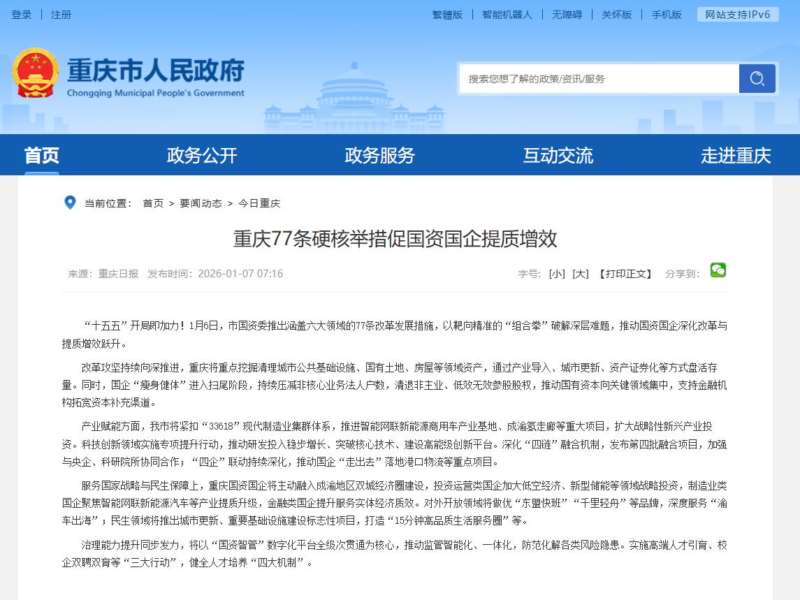 “十五五”开局即加力!1月6日,重庆市国资委推出涵盖六大领域的77条改革发展措施,以靶向精准的“组合拳”破解深层难题,推动国资国企深化改革与提质增效跃升。