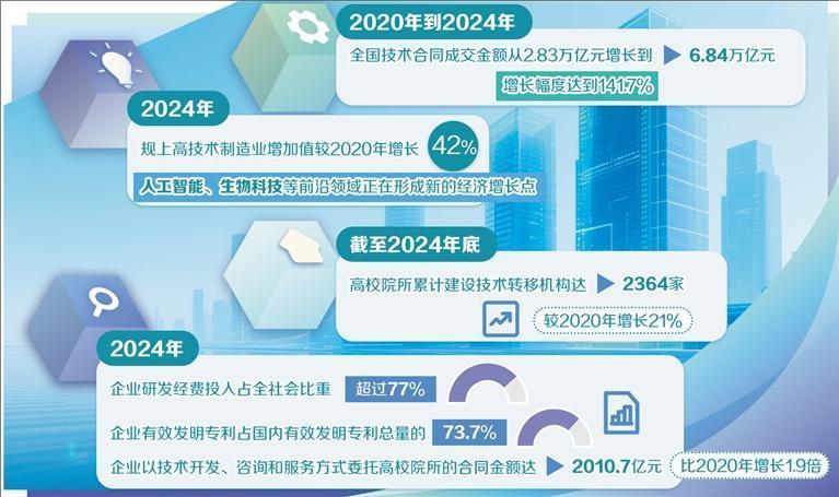 日前,十四届全国人大常委会第十九次会议专门听取了科技部副部长陈家昌受国务院委托作的关于促进科技成果转化工作情况的报告。报告显示,2020年至2024年,全国技术合同成交金额从2.83万亿元增长至6.84万亿元,增幅达141.7% 2024年规上高技术制造业增加值较2020年增长42%,人工智能、生物科技等前沿领域正加速形成新的经济增长点。要把科技创新这一“关键变量”转化为高质量发展的“最大增量”,关键要畅通成果转化路径。“十四五”以来,我国科技成果转化实现量质齐升,是多方合力、久久为功的结果。