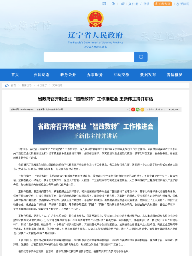 1月13日,辽宁省政府召开制造业“智改数转”工作推进会,深入学习贯彻党的二十届四中全会和中央经济工作会议精神,全面贯彻落实习近平总书记关于新型工业化的重要论述和对辽宁的重要讲话重要指示精神,按照省委要求,研究推进制造业智能化改造、数字化转型工作。省委副书记、省长王新伟主持会议并讲话。