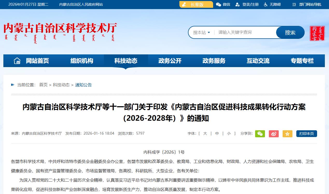 日前,内蒙古自治区科技厅、发改委等11部门联合印发《内蒙古自治区促进科技成果转化行动方案(2026-2028年)》,旨在通过系统性改革与精准施策,打通科技成果向现实生产力转化的关键堵点,以制度改革与平台赋能激发科技成果转化新动能,为经济社会高质量发展注入强劲动力。