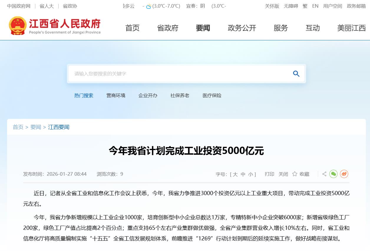 近日,从江西省工业和信息化工作会议上获悉,今年,我省力争推进3000个投资亿元以上工业重大项目,带动完成工业投资5000亿元左右。