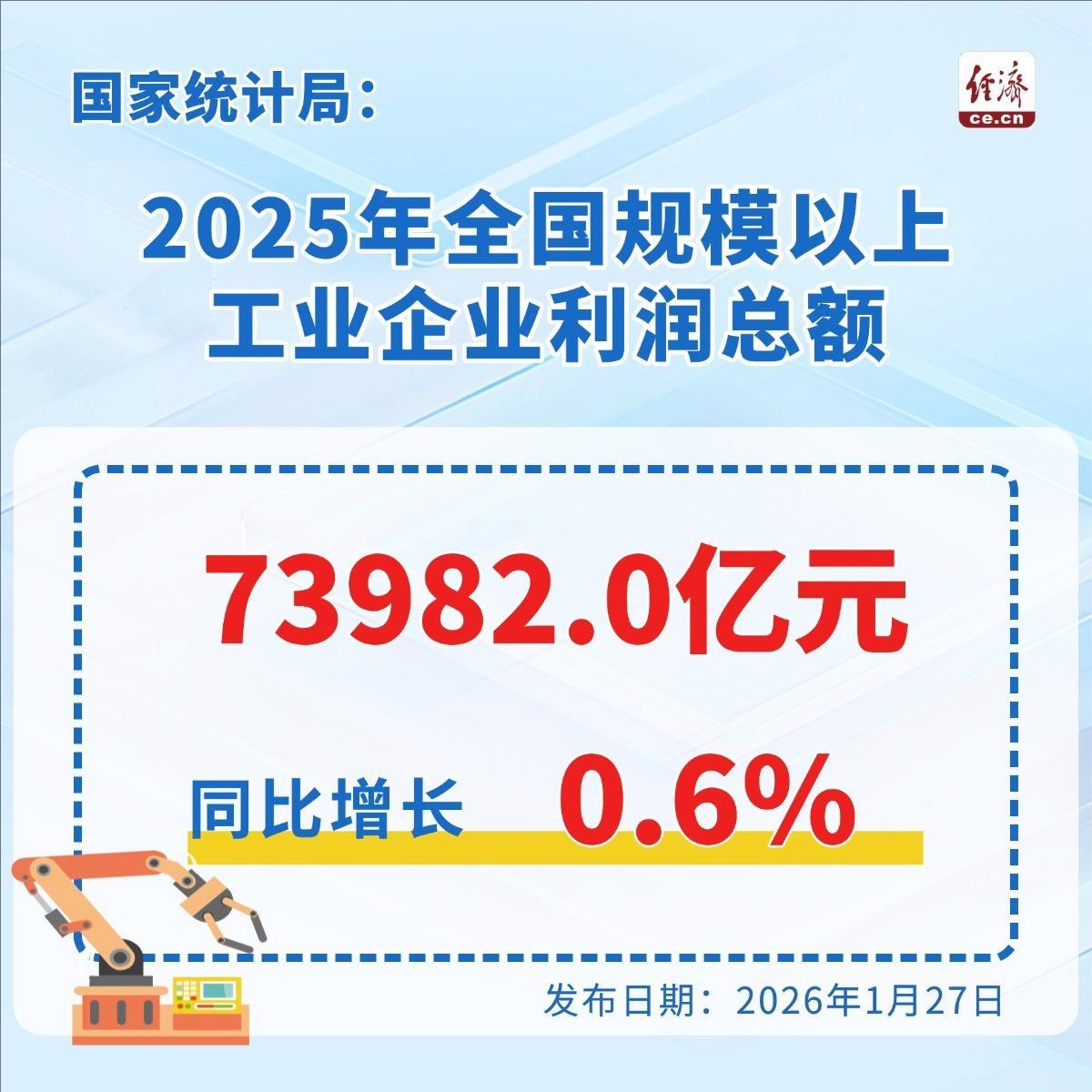 国家统计局1月27日发布数据显示,2025年,全国规模以上工业企业实现利润总额73982.0亿元,比上年增长0.6%。