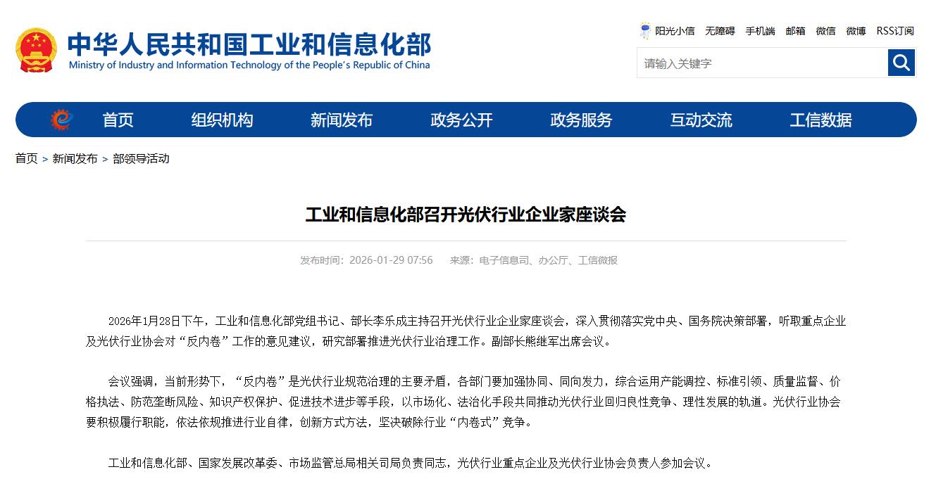 2026年1月28日下午,工业和信息化部党组书记、部长李乐成主持召开光伏行业企业家座谈会,深入贯彻落实党中央、国务院决策部署,听取重点企业及光伏行业协会对“反内卷”工作的意见建议,研究部署推进光伏行业治理工作。副部长熊继军出席会议。