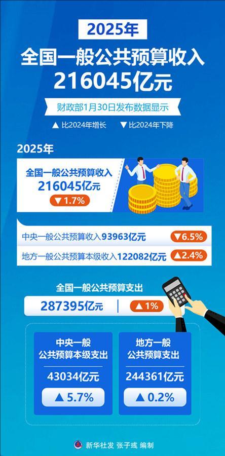 财政部日前发布的数据显示,2025年,全国一般公共预算收入216045亿元,比2024年下降1.7% 全国一般公共预算支出287395亿元,比2024年增长1%。其中,重点支出保障有力,教育支出43417亿元,比上年增长3.2% 科学技术支出12062亿元,比上年增长4.8% 社会保障和就业支出44416亿元,比上年增长6.7%。