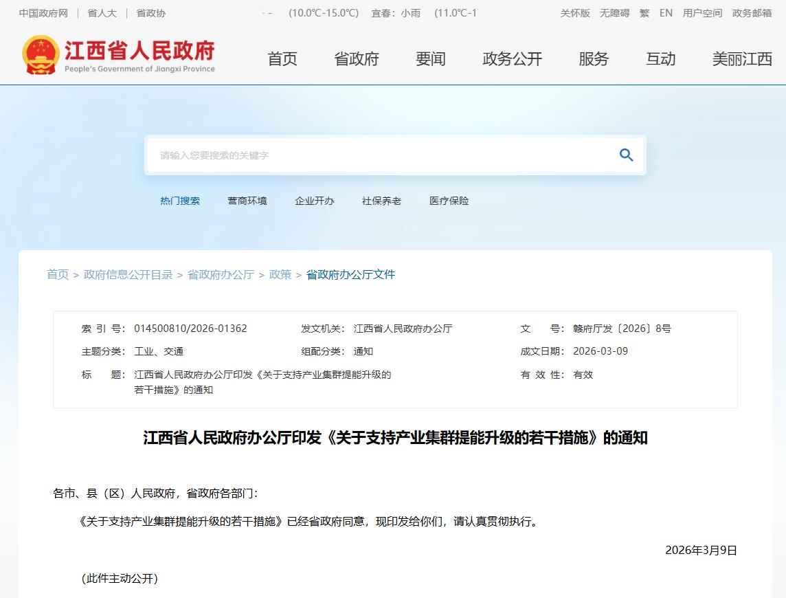 3月13日,江西省人民政府办公厅印发《关于支持产业集群提能升级的若干措施》,推出多项先进制造业集群扶持政策。