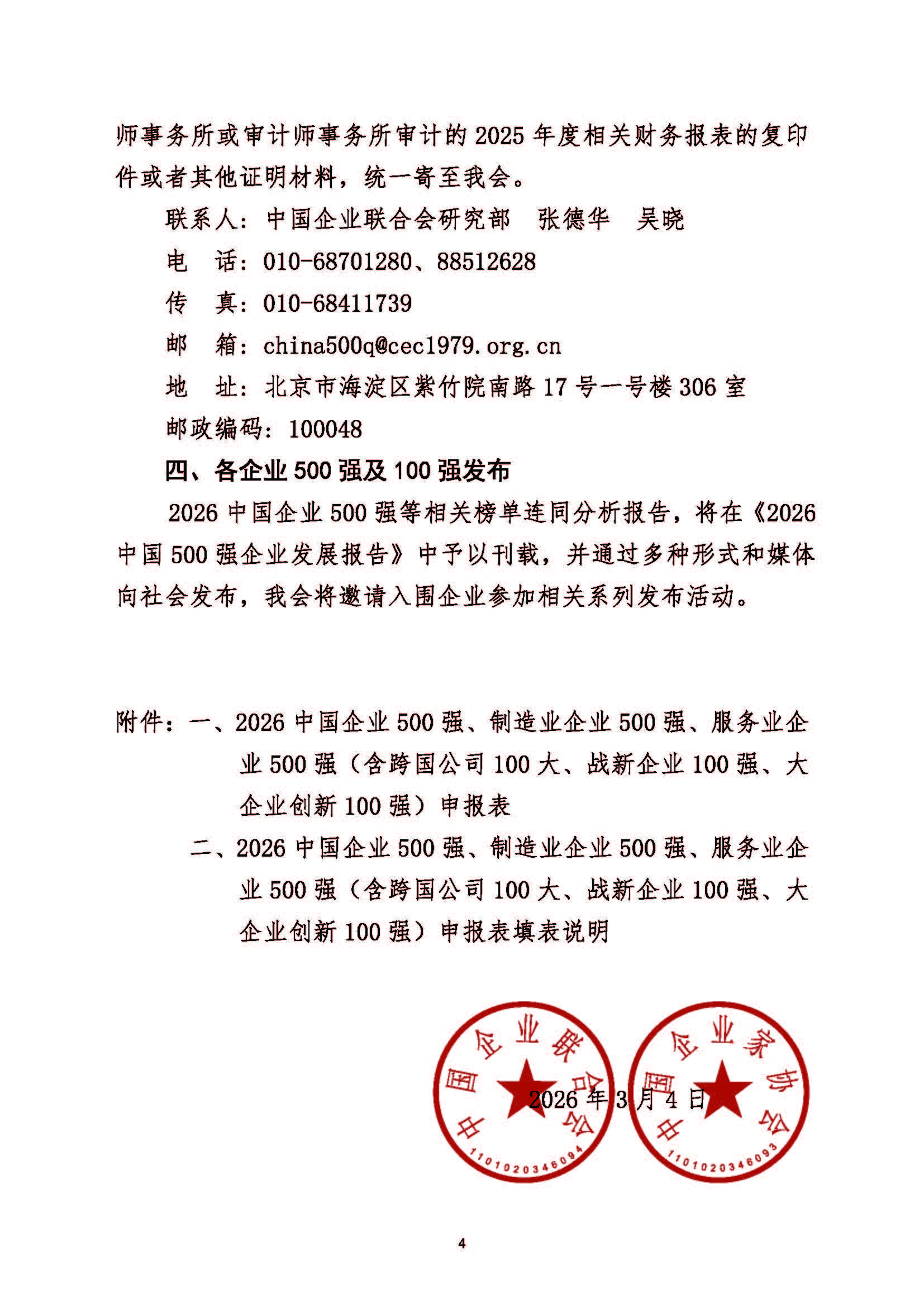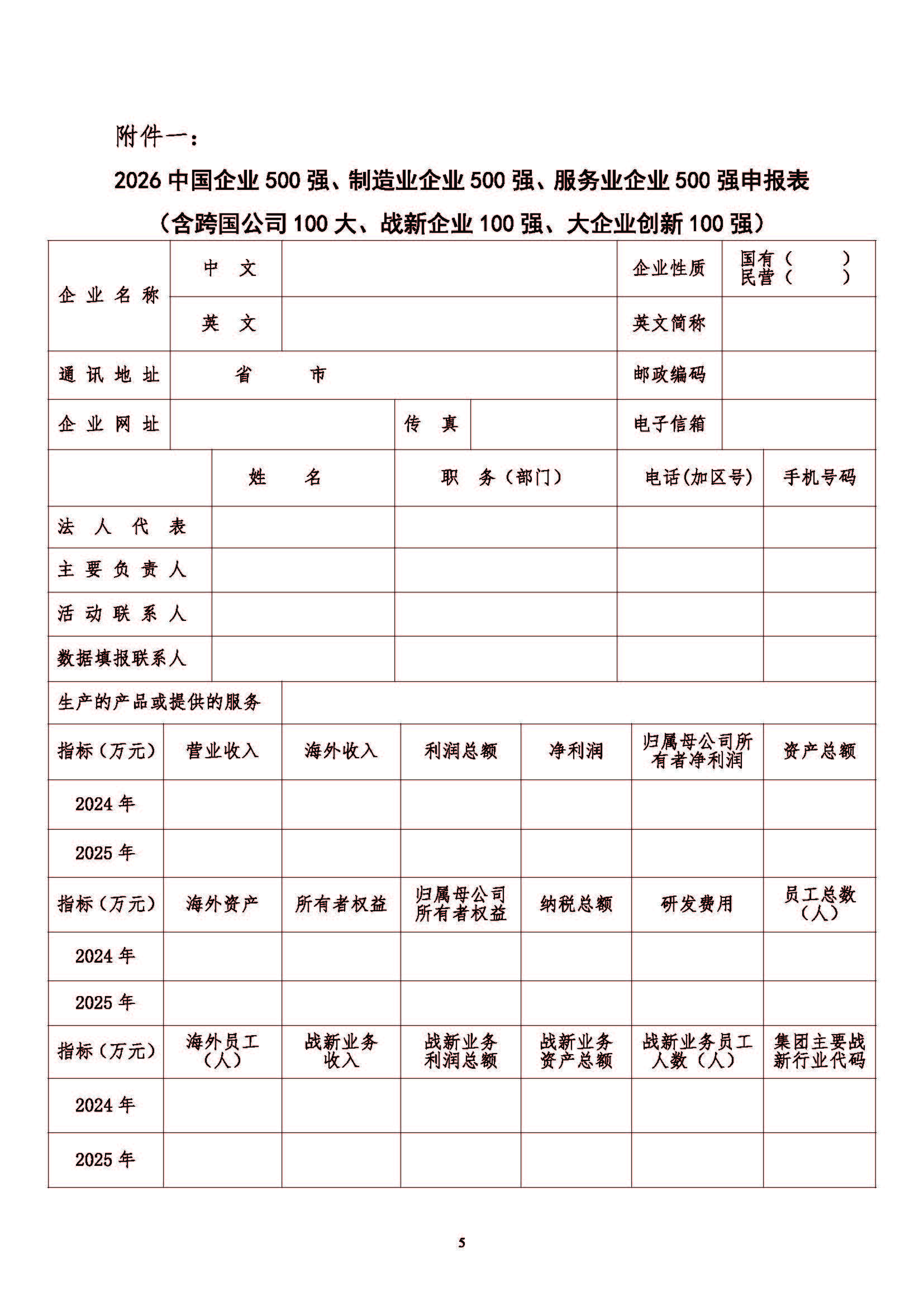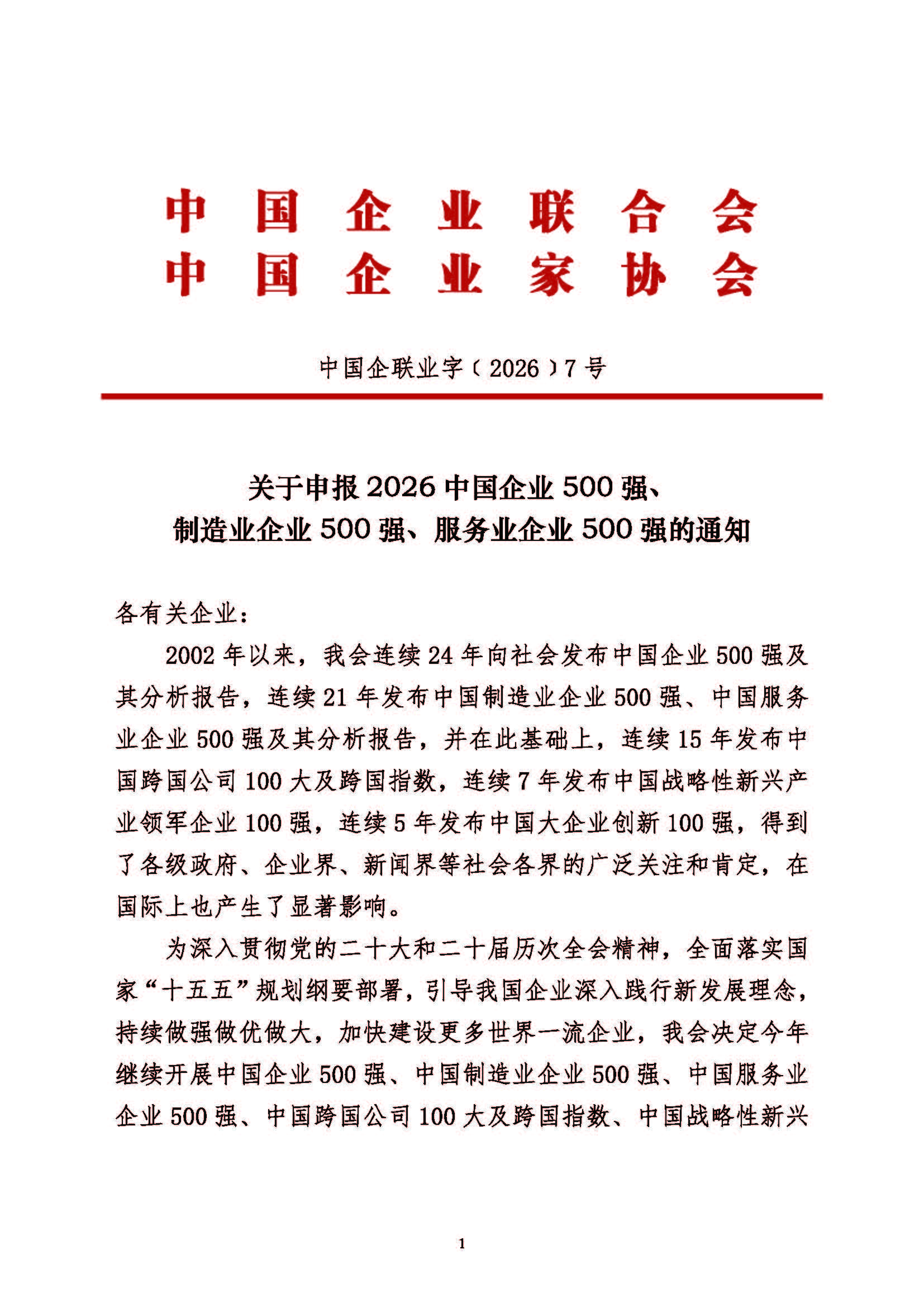 关于申报2026中国企业500强、制造业企业500强、服务业企业500强的通知