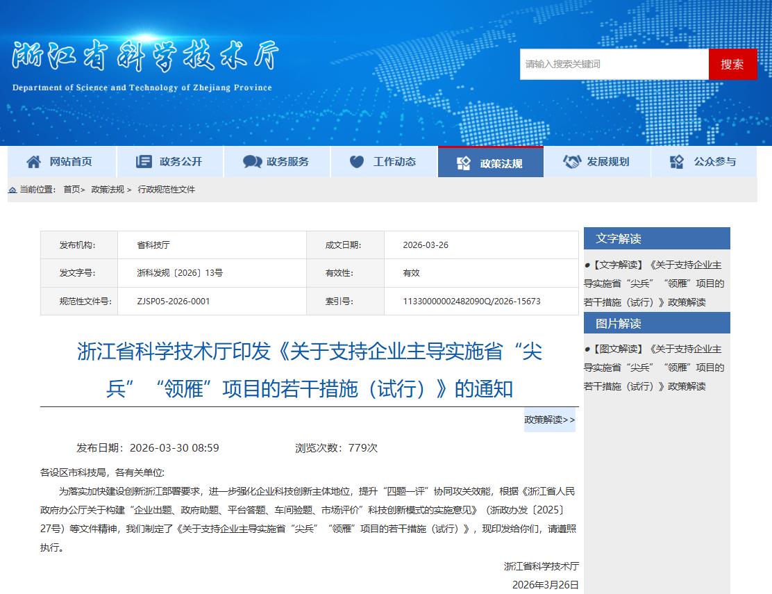 浙江省“尖兵”项目是指重大科技计划项目,“领雁”项目是指应用基础研究计划项目,二者均系浙江省为突破关键核心技术、推动经济社会高质量发展而设立的省级重大专项。