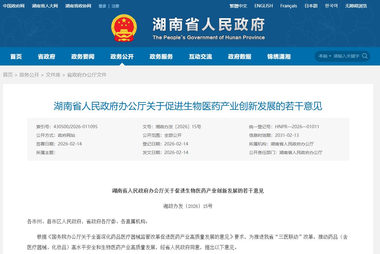 湖南日前出台《关于促进生物医药产业创新发展的若干意见》(以下简称《若干意见》),着力通过“有效市场”与“有为政府”协同发力,引导资源向基础研究、源头创新和关键技术攻关集聚。