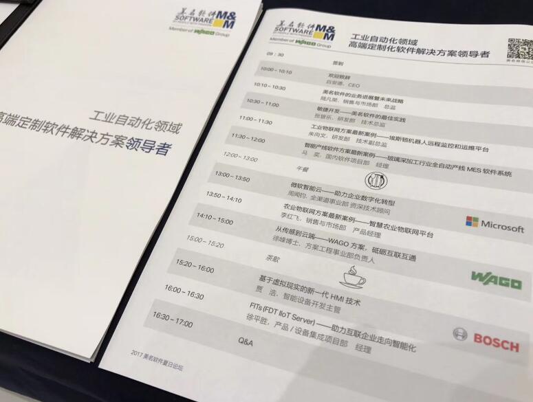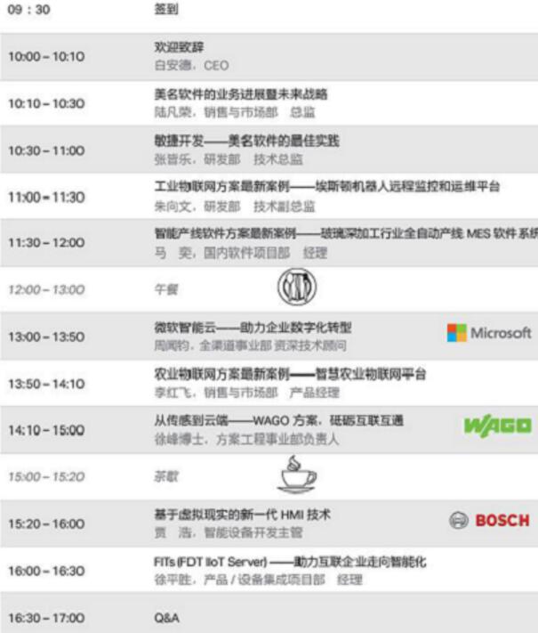 2017年9月12日,第七届美名软件夏日论坛迎来了如约而至的近100位参会嘉宾。一如既往,论坛旨在分享工业自动化行业内的前沿动态,典型技术方案,以及具有代表性的行业/领域应用案例和实践,为参会者提供价值,并创造一个开放交流的平台。本次夏日论坛的主题,包括美名软件的最新业务进展和战略,工业软件在工业机器人、智慧农业、智能产线等领域的典型应用,微软云平台以及人工智能服务,德国博世集团的互联工业实践,WAGO集团从设备到云端的系统解决方案,以及FDT技术与OPC,工业物联网、移动应用等技术的融合与发展成果。